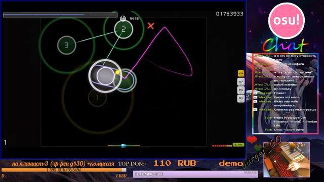 Support the stream: https://streamlabs.com/burger_go Стримлю когда не лень и есть наcтроение) ==================================================== Девайсы: Мышка - CMSTORM MS2K(калл за 5 рублей) Клавиатура - CMSTORM(мембранка) Наушники - bloody g501 1 Монитор - samsung S22D300 2 Монитор - ViewSonic VP720 ==================================================== Железо: Видеокарта - nvidia GTS250 Процессор - intel core i3-4160 ОЗУ - 8gb ==================================================== Мой скин в осу(голубая читанда): https://yadi.sk/d/Yw-MCX_-3M4aNz Скин в osu(blue megumin): https://yadi.sk/d/o0pTBReq3LbQpc ==================================================== Донат на экран - http://www.donationalerts.ru/r/burger_g0