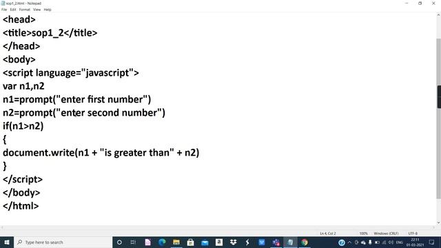 Click on the link for other videos of Skill set 3 - JavaScript https://youtube.com/playlist?list=PLoONJDdxEfrl58-Aj90dlqAQvUOsq8PFa SOP 1 : Create JavaScript program for the following using appropriate variables, JavaScript inbuilt functions and control structures. To accept two integers and display larger number of them.