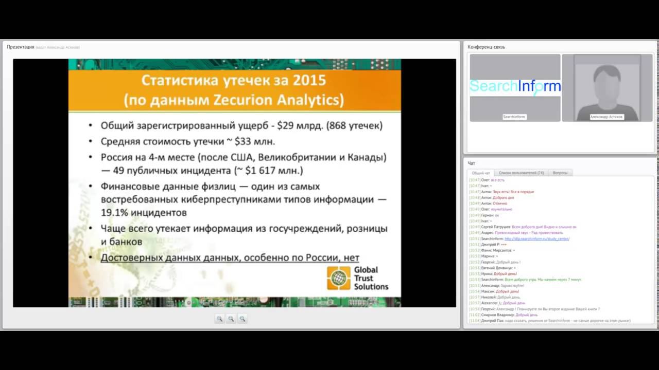 Вебинар от 08.06.2016. Ведущие: Александр Астахов, генеральный директор Global Trust Solutions Алексей Дрозд, директор учебного центра SearchInform. Вебинар затрагивает одну из тем нового совместного с Group-IB и Global Trust Solutions учебного курса "DLP от А до Я". Подробности: http://searchinform.ru/training/training-center.html