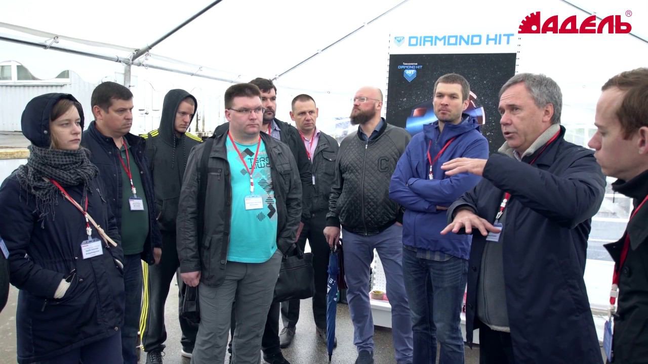 15 июня 2017 года заводом «Дельта», производителем сегментов под торговой маркой «Адель», совместно с компанией «Адель Инструмент» был организован и проведен в Зеленограде очередной тематический семинар из цикла «Сверлим железобетон правильно!», посвященный проблемам алмазного сверления железобетона. Это был первый в этом году семинар данного цикла, прошедший на открытой площадке. Его основной темой стало сверление железобетона всухую. Холодное лето 2017 года и в этот день не баловало нас. Тем не менее, к приходу гостей все стенды были готовы, образцы расставлены, раздаточные материалы выложены. По настоящему заинтересованных людей капризы природы не останавливают, и первые участники еще до начала мероприятия знакомились с экспонатами, с каталогами и буклетами, общались с коллегами. Начался семинар с презентации новейшей технологии для сухого сверления с микроударом Diamond Hit, разработанной специалистами завода «Дельта». После краткого рассказа о сути предложенного метода, его особенностях и преимуществах, началась практическая часть. Она была построена на сравнительных тестах сверления традиционными подрозетниками и инструментом DH. Первой тестировалась коронка сторонней компании, купленная в строительном супермаркете. К сожалению, досверлить ей до конца так и не получилось. Время сверления перевалило разумные пределы. Вскрытие сегментов на заточном круге не спасло положение. Поэтому далее в качестве тестовой традиционной коронки использовали красную коронку для подрозетников производства «Адель». Сверление коронкой DH показало себя с самой лучшей стороны как по временным показателям, так и по комфортности работы. В отличие от традиционной коронки при использовании новой технологии с легкостью была пройдена 12-я арматура, заложенная в тестовый блок. Всем собравшимся было предложено самостоятельно посверлить как бетон, так и арматуру и почувствовать разницу на деле. Многие из гостей согласились и стали участниками тестирования. Общее мнение испытателей - технология DH работает гораздо эффективнее и комфортнее традиционной. После сверления отверстий для подрозетников очень своевременной была презентация технологии разметки с помощью шаблонов. Было рассказано о преимуществах этого метода и на практике показано, как можно использовать шаблоны на различных поверхностях при монтаже розеток. После небольшого перерыва, во время которого гостям были предложены традиционные пирожки с чаем и кофе, продолжилась презентация новейшей технологии сухого сверления DH. Гостям было рассказано еще об одном направлении использования сухого сверления, а именно об изготовлении отверстий в ступенях при монтаже перил. Как правило, к моменту монтажа перил чистовая отделка уже проведена и сверлить с водой категорически нельзя. Вот тут и приходит на помощь технология сухого сверления Diamond Hit или DH. Как это происходит на практике было показано на специальном стенде, имитирующем ступени. Для работы была использована коронка DH диаметром 42 мм и длиной 100 мм, что вполне достаточно для решения поставленной задачи. Сверление проводилось машиной для ручного сверления Cardi P2000 MS-13-K с микроударом в комплекте со стойкой Cardi L160 Comact с вакуумной плитой. Наличие стойки позволяет точно выдерживать заданный угол наклона отверстия, что очень важно пр