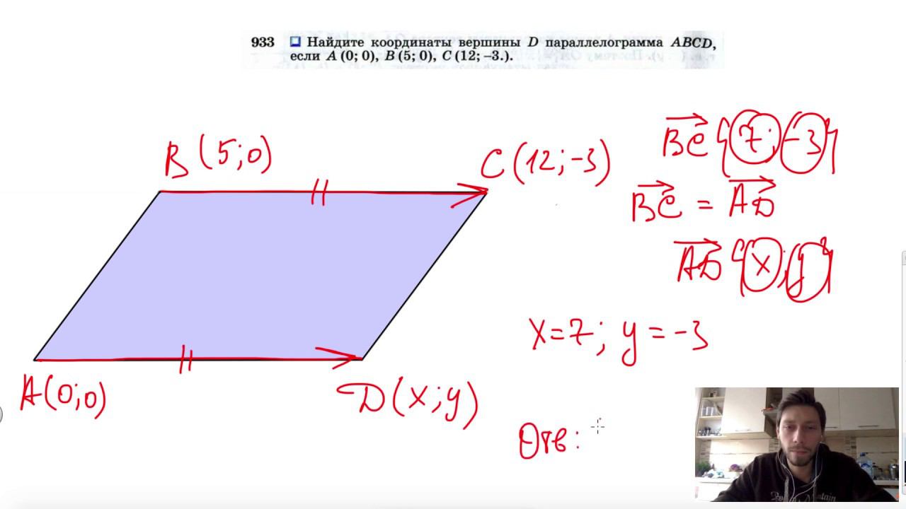 №933. Найдите координаты вершины D параллелограмма ABCD, если А (0; 0), B (5; 0), С (12; -3.).