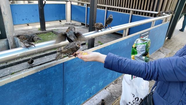 Скворцы не боятся людей и едят прямо с рук.Если вкусняшки закончатся могут ущипнуть и за палец))))