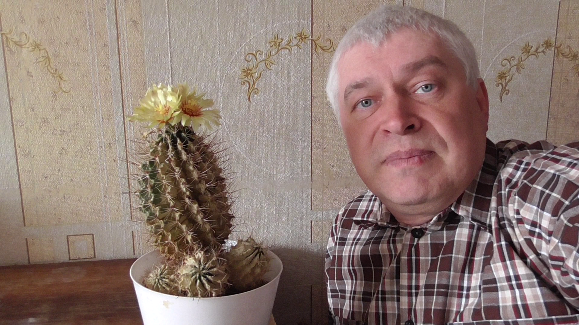 У меня цветёт кактус. На кактусе четыре жёлтых цветка