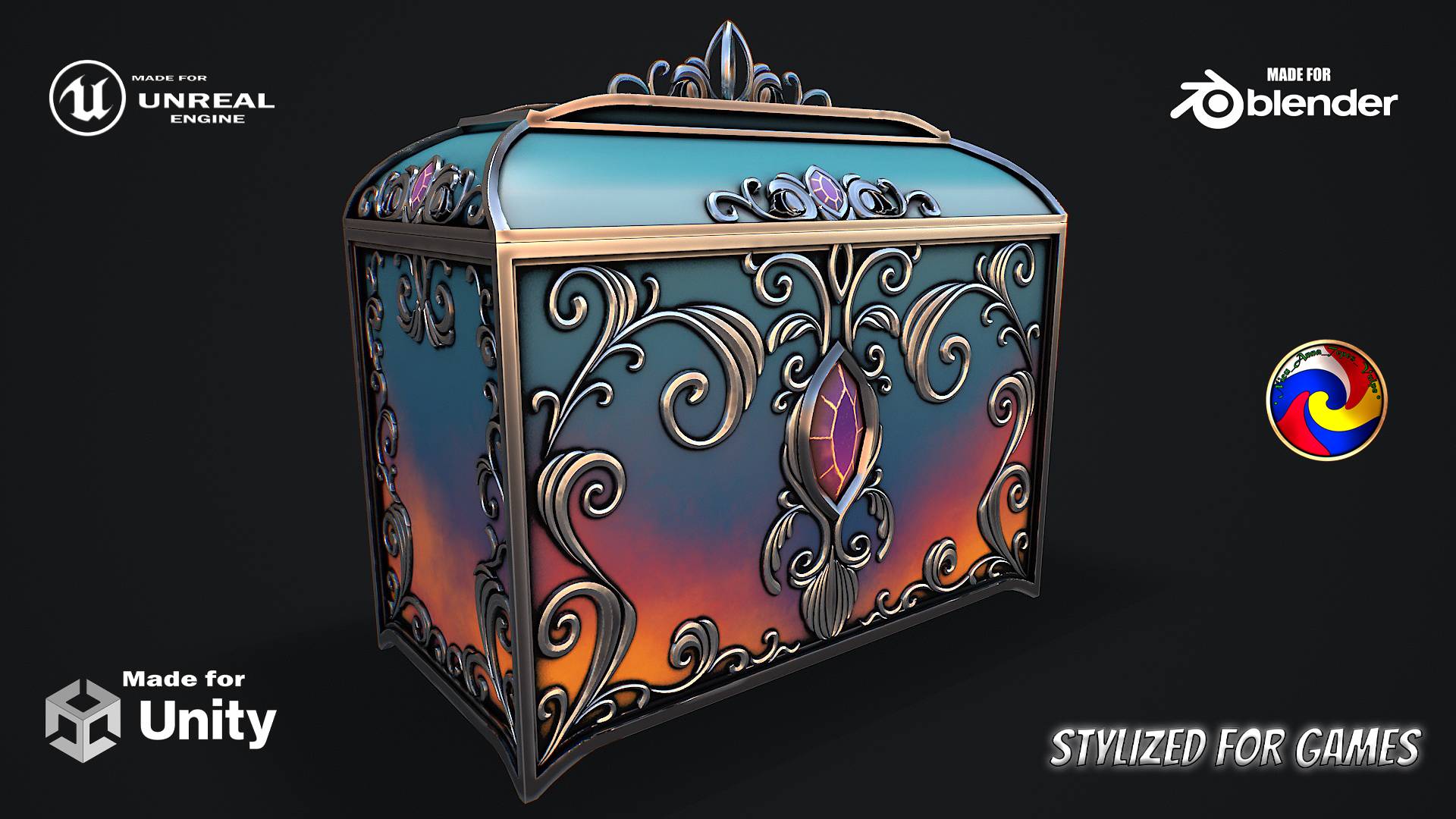 Fantasy Chest Stylized game ready 3d model polys - 73992 verts - 85476 tris - 147984 textures - 34 materials - 4 chest, loot, stylized, box, metal, magic, flame, medieval, sci-fi, storage, historical, fantasy, game, design, container, military, survival, ammunition, case, Hello. This is a high definition quality polygon of a Fantasy Chest Stylized game ready 3d model with PBR textures. Extremely detailed and realistic. Suitable for movie prop, architectural visualizations, advertising renders, games, VR, AR and other. The archive includes HDRI, Obj and FBX, Marmoset scene, Blender scene, textures for the PBR: Base color, Metallic, Mixed AO, Normal_OpenGL, Roughness. And also included in the archive textures for UE: BaseColor, Normal, OcclusionRoughnessMetallic. All textures are 2k resolution. The number of materials corresponds to the number of main objects in the scene. There are 4 materials in the scene: Fantasy_Chest_Body_glass, Fantasy_Chest_Body_metal, Fantasy_Chest_lid_glass, Fantasy_Chest_lid_metal. The model contains 2 objects.