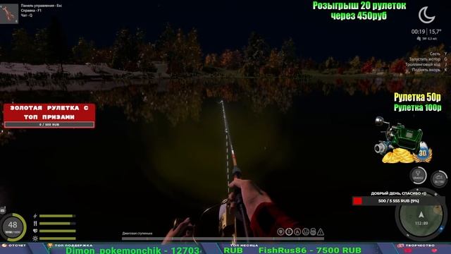 Поддержка донатом https://new.donatepay.ru/@1032463 Альтернативный донат https://www.donationalerts.com/r/kalyamba11 5536913964533059 карта Тинькоф Если стрим лагает,смотри стрим на трово https://trovo.live/s/Kalyamba_na_Ribalke Мой ВК - https://vk.com/kalyantv НИК в игре kalyan11 НАШ ДИСКОРД СЕРВЕР https://discord.gg/3ZeEDGs5h6 Заказ водоема на 1 час - 500р ( весь стрим 2500р ) Модерка на канале 1300р ( каждая следующая на 100р больше) ✅Призы в рулетке "ЗОЛОТАЯ" 500р ✔ ЗОЛОТО ✔ ПРЕМ ✔ КАТУШКИ РАПТОР 40, ВЕНГИ, ТАЙГА, СИЛЬВЕР 80, И другие ✔ ПАЛКИ ПИЛКЕРНАЯ, ДОНКА МОРСКИЕ, ✔ РОД ПОД, СТУЛЬЯ ✅Призы в рулетке СТАНДАРТ : 100р ✔ катушкИ РАПТОР 40, ВЕНГИ, ТАЙГА, СИЛЬВЕР 80, И другие ✔ катушки 60 для медного ( ЭВИИ, НАТОРЫ, ГОЛДА, и тд) ✔ ПИЛКЕРНОЕ УДИЛИЩЕ КОРОЛЕВА ОКЕАНА ✔ Морское Донное удилище ✔ прем ( 3, 7, 30 дней) ✔ золото ( 1, 3, 5, 10, 20 ,50) ✔ билет на море ( 1, 3, 5 дней) ✔ голд наживка и др. ✅Призы в рулетке "СТАРТОВАЯ" 50р ✔ катушка Венга ✔ катушка "silver80" ✔ катушка "БЕЛЫЙ КАЛИБР" ✔ катушка "Черный калибр" ✔ катушка "Протон" ✔ катушка "Нарга 6000" ✔ Набор Фидерист и спинингист ✔ Карповик Фортуна ✔ фидерные удилища ✔ прем, золото, алкашка, наживки и тд P.s Рулетка это не казино, а награда за поддержку стримера. Вечный ТОП ПОДДЕРЖКИ (10.06.2025) 1. Леха сварной 214 572 2. Dimon_pokemonchik 127 034 3. Skreb79 103 061 4. Interceptor 96 230 5. FishRus86 82 500