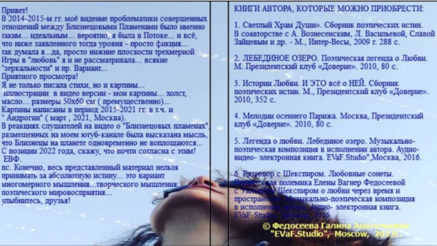 Helena Vagner Fedoseeva Вышла моя новая аудио-видео книга, март 2022. Посмотреть и послушать можно на моем канале ютуб ЕВФ, дзен, рутуб, вк. Можно приобрести! Елена Вагнер Федосеева БЛИЗНЕЦУ… Поэтические размышления автора на тему «Близнецовые пламена». «…У нас одно, единственное сердце, Родная, Близнецовая моя душа… Я знаю: Бог откроет дверцу В наш Мир, где ты и ОН...и я…» Музыкально-поэтическая композиция в исполнении автора. Аудио& видео книга. EVaF-Studio, Moscow, 2022. ОТ АВТОРА: Привет! В 2014-2015-м гг. моё видение проблематики совершенных отношений между Близнецовыми Пламенами было именно таким... идеальным... вероятно, я была в Потоке... и всё, что ниже заявленного тогда уровня - просто фикция... так думала я...да, просто нижние плоскости трехмерной Игры в "любовь" я и не рассматривала... всякие "зеркальности" и пр. Вариант... Приятного просмотра! Я не только писала стихи, но и картины... иллюстрации в видео версии - мои картины... холст, масло... размеры 50х60 см ( премущественно)... Картины написаны в период 2015-2021 гг. в т.ч. и " Андрогин" ( март , 2021, Москва). В реакциях слушателей на видео о "Близнецовых пламенах", размещенных на моем ютуб-канале была высказана мысль, что Близнецы на планете одновременно не воплощаются... С позиции 2022 года, скажу, что почти согласна с этим! ЕВФ. пс. Конечно, весь представленный материал нельзя принимать за абсолютную истину... это вариант многомерного мышления...творческого мышления... поэтического мировосприятия... улыбнитесь, друзья! Для инфо: ЕЛЕНА ВАГНЕР ( Федосеева) - творческое и журналистское имя Федосеевой Галины Анатольевны, кандидат экономических наук, доцент, поэт, писатель, художник, независимый журналист, член Дома ученых, член Союза писателей России, член Союза писателей и переводчиков, член Российского союза писателей, член Союза журналистов России, член МЕДИАСОЮЗА, исполнительный директор Гильдии журналистики о моде и стиле жизни, член Международного союза журналистов, член Клуба писателей Центрального Дома Литераторов, член Российского творческого союза работников культуры, Руководитель секции ПОЭЗИИ МО РТСРК, награждена дипломом им. М.Ю. Лермонтова " Недаром помнит вся Россия" и медалью " М.Ю. Лермонтов 1824-1841", , памятной медалью " 200 лет со Дня рождения Н.В. Гоголя" "За труды в просвещении", медалью "850-летия Москвы", медалью "125 лет Маяковскому", медалью " 220 лет А.С.Пушкину", Знаком отличия Звезда "НАСЛЕДИЕ" за литературную деятельность в духе традиций русской культуры, медалью « 125 лет Маяковскому», медалью «60 лет МГО Союза писателей России, медалью "220 лет А.С.Пушкину", медалью " А.Ахматова 130 лет", медалью «Иван Бунин 150 лет», медалью "Сергей Есенин", Знаком отличия Звезда "НАСЛЕДИЕ" 2-ой степени за литературную деятельность в духе традиций русской культуры, медалью "Федор Достоевский 200 лет"... автор научных трудов, монографий, учебников, статей, автор сборников поэзии, аудио-видео-электронных книг, участник выставок живописный работ, автор картин...