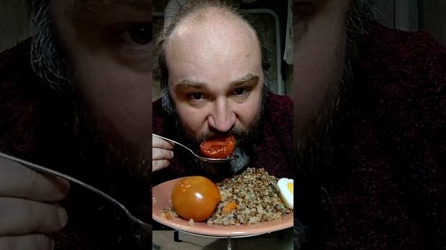 Гречка по-купечески, соленые помидорки, яйцо. Вот это я
