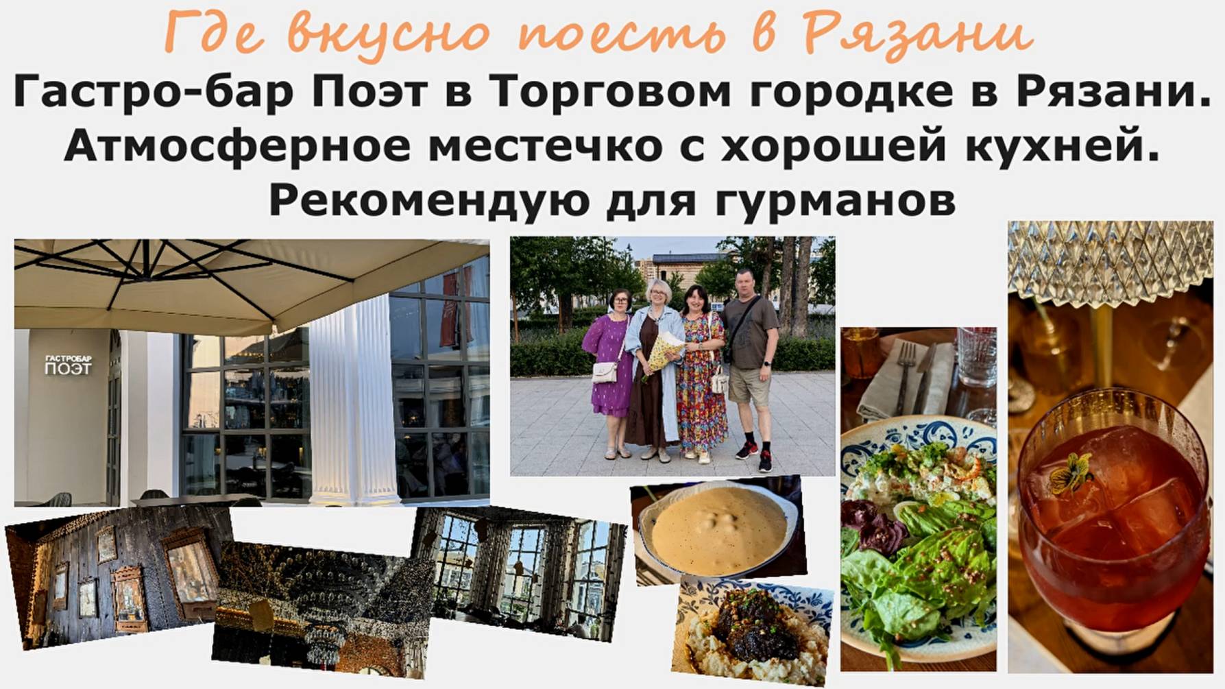 Гастро-бар, где мы были, называется Поэт и находится в одном из павильонов Торгового городка. Я помню как его делали, заглядывала внутрь года 3 назад, снимала работу для видео, и в нем была уже сделана только центральная стойка с березовыми поленьями, которая сейчас служит баром. Очень красивое и атмосферное место. Дизайн гастро-бара выполнен в стиле Есенина с чтениями стихов официантами и сотрудники гастро бара, с тематическими «кутежами». Мне понравилось как оформлен и зал, и само меню, как одеты девочки официанты, как там уютно и мило - аккуратные небольшие столики на 2-4 человека, лампы под старину, такие же раритетные старые зеркала на стенах, большие окна и светлые шторы на них с рисунком под стволы берез, под потолком необычная люстра ярусами из фужеров. Эстетическая подача десерта и коктейлей с необычными есенинскими названиями (имена и фамилии его женщин🤭). Сметанник подается не классически , а как скрэмбл, то есть жидкий - необычно, и очень вкусно. Вроде и праздник отмечаешь, общаешься, и одновременно погружаешься в литературную атмосферу, это необычно, интересно и увлекательно, ненавязчиво, где работники бара каждый час читают стихи Есенина. И готовят там очень #вкусно. Мне очень понравилось #меню, я готова была там попробовать все, но ограничилась томленной в квасном сусле говяжьей голенью и салатом с #оливье из утки 🦆 с раковыми шейками (предполагаю, что это были просто креветки) 🍤. У Серёги глазами ела из его тарелки .... ************************************************************************ Кому нравятся мои путешествия и видео-прогулки по разным городам, моя незатейливая кулинария, мое шитье и куклы, видео релакс о нашей дачке и мой жизненный настрой и позитив, которым я делюсь с другими - большое вам спасибо за это! ПоБЛАГОДАРИТЬ МЕНЯ ЗА МОЮ РАБОТУ ЛЕГКО - карта Сбербанк: 2202 2067 0645 4373 - буду очень признательна! QR-код для перевода онлайн Сбербанк в конце каждого видео. Спасибо за любую поддержку! С уважением, Анжелина. ✅Основной ютуб https://www.youtube.com/@anzhelina_magadan_ryazan/videos ✅Ютуб Шьем с Анжелиной Джоли https://www.youtube.com/@anzhelina_jolie_/videos У КОГО НЕ РАБОТАЕТ ЮТУБ В РОССИИ: ✅Канал рутуб https://rutube.ru/channel/26492427/ ✅Дзен https://dzen.ru/id/622e9c73f53aef1fff... ✅Все видео ВКонтакте https://vk.com/club226856756 / @anzhelina_jolie_ ✅Моя творческая мастерская в ВК https://vk.com/public212000538 ✅Играю в куклы в ВК https://vk.com/club224828421 ✅Готовим с Джоли в ВК https://vk.com/club223193761 ✅Телеграмм для общения подписчиков и друзей Анжелина&Компания https://t.me/TDZvbN1Kd0zOTg6 - группа закрытая, стучаться! ✅Телеграмм новостной со ссылками на все публикации https://t.me/anzhelina_osim_chaim ✅Телеграмм Шьем с Анжелиной Джоли https://t.me/sewing_jolie ✅Телеграмм МИР КУКОЛ https://t.me/Qnpa6Jmld4yh_y8d ✅Телеграмм Мода/стиль/идеи/шитье https://t.me/moda_style_idei_sewing ✅Мои публикации на бейбиках про кукольное хобби https://babiki.ru/profile/zakharchuk/...