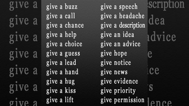 ✅ Перевод: ◀️give a buzz - позвонить кому-то / доставить удовольствие; ◀️give a call - позвонить кому-то; ◀️give a chance - дать шанс; ◀️give a help - оказать помощь; ◀️give a choice - предоставить выбор; ◀️give a guess - давать попытку / подсказку; ◀️give a lead - дать зацепку / наводку; ◀️give a hand - помочь кому-то в чем-то; ◀️give a hug - обнять; ◀️give a kiss - поцеловать; ◀️give a lift - подвезти (подбросить) куда-то; ◀️give a speech - выступить с речью; ◀️give a headache - вызывать головную боль; ◀️give a description - дать описание; ◀️give an idea - дать идею / натолкнуть на мысль; ◀️give an advice - дать совет; ◀️give hope - давать надежду; ◀️give notice - уведомить, известить; ◀️give news - сообщать новости; ◀️give evidence - давать показания; ◀️give priority - отдавать предпочтение; ◀️give permission - дать разрешение. 🔊 Чтобы прослушать, увеличьте громкость!