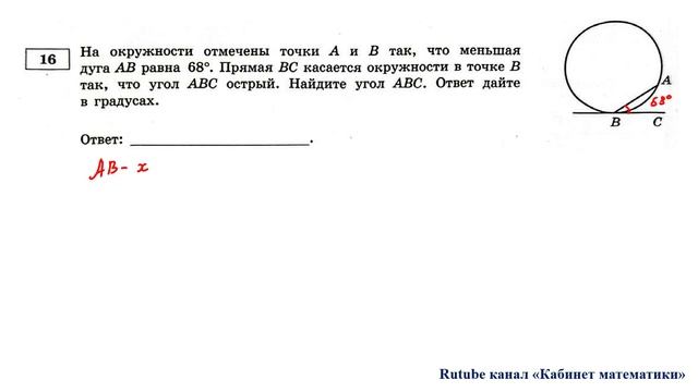 Задание 16. На окружности отмечены точки А и В так, что меньшая дуга АВ равна 68. Прямая ВС касается окружности в точке В так, что угол АВС острый. Найдите угол АВС. Ответ дайте в градусах. Курсы для подготовки к ОГЭ и ЕГЭ по математике: https://stepik.org/users/608571559/teach Группа ВК для подготовки к ОГЭ: https://vk.com/secretroom2023 Подготовка к ОГЭ по математике