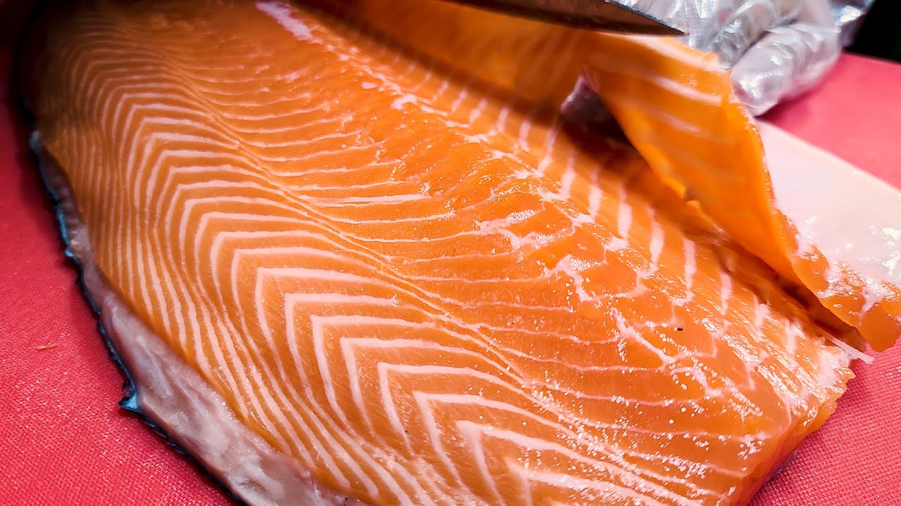 Навыки нарезки лосося, филе целого лосося, сашими из лосося, креветки в соевом соусе.