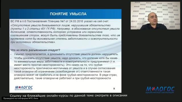 Авторская видеолекция Артема Карапетова «Судьба оговорок об ограничении ответственности на фоне умышленного нарушения договора» На лекции рассматриваются ключевые вопросы правового режима оговорок об ограничении ответственности в ситуации, когда договор был нарушен умышленно, и применения п. 4 ст. 401 ГК РФ. Программа: 1. Типы оговорок об ограничении договорной ответственности 2. Судьба оговорок об ограничении ответственности при умышленном характере нарушения 3. Понятие умышленного нарушения. Проблема отграничения умысла от грубой неосторожности 4. Распределение бремени доказывания и обоснованность презумпции умышленного характера нарушения 5. Работает ли правило п.4 ст. 401 ГК РФ в целях преодоления согласованного верхнего предела начисления пени? 6. Применимость правила п. 4 ст. 401 ГК РФ к оговоркам об ограничении иных средств защиты (права на расторжение договора, соразмерное снижение цены, понуждение к исполнению обязательства в натуре). Лектор: Артем Карапетов — д.ю.н., директор Юридического института «М-Логос», главный редактор Вестника экономического правосудия (https://m-logos.ru/lecturers/karapetov-artem-georgievich/ ) *** Эту лекцию можно посмотреть на сайте Института: https://m-logos.ru/product/m-lawbooksavtorskaya-videolekcziya-artema-karapetova-sudba-ogovorok-ob-ogranichenii-otvetstvennosti-na-fone-umyshlennogo-narusheniya-dogovora-2/ *** Более подробно данные вопросы рассматриваются в рамках онлайн-курса повышения квалификации Юридического института "М-Логос": ✅ Практикум по доказыванию и взысканию убытков при нарушении договора: правовые и практические аспекты 03.02.26 - 13.03.26 (39 ак.ч.) https://m-logos.ru/onlain_seminars/onlajn-programma-povysheniya-kvalifikaczii-praktikum-po-dokazyvaniyu-i-vzyskaniyu-ubytkov-pri-narushenii-dogovora/164316_03022026_13032026/ ✅ top! Комплексное долгосрочное повышение квалификации юристов 17.02.26 - 16.07.26 (191 ак.ч.) https://m-logos.ru/onlain_seminars/vechernyaya-onlajn-programma-kompleksnoe-dolgosrochnoe-povyshenie-kvalifikaczii-yuristov/164492_17022026_16072026/ ✅ top! Договорное и обязательственное право: актуальные проблемы, судебная практика, эффективная договорная работа 17.02.26 - 22.05.26 (94 ак.ч.) https://m-logos.ru/onlain_seminars/vechernij-onlajn-kurs-povysheniya-kvalifikaczii-dogovornoe-pravo-aktualnye-problemy-sudebnaya-praktika-effektivnaya-dogovornaya-rabota/164498_17022026_22052026/ *** Все курсы по вопросам договорного и обязательственного права смотрите здесь https://m-logos.ru/direction/contract/ 📚 Расписание всех курсов смотрите на сайте Института https://m-logos.ru/onlain_seminars/ 🎬 Рекомендуем другие бесплатные лекции (раздел регулярно обновляется) https://m-logos.ru/online_lectures *** Анонсы предстоящих бесплатных лекций публикуются в социальных сетях Института: ВКонтакте https://vk.com/m_logos Телеграм-канал https://t.me/m_logos