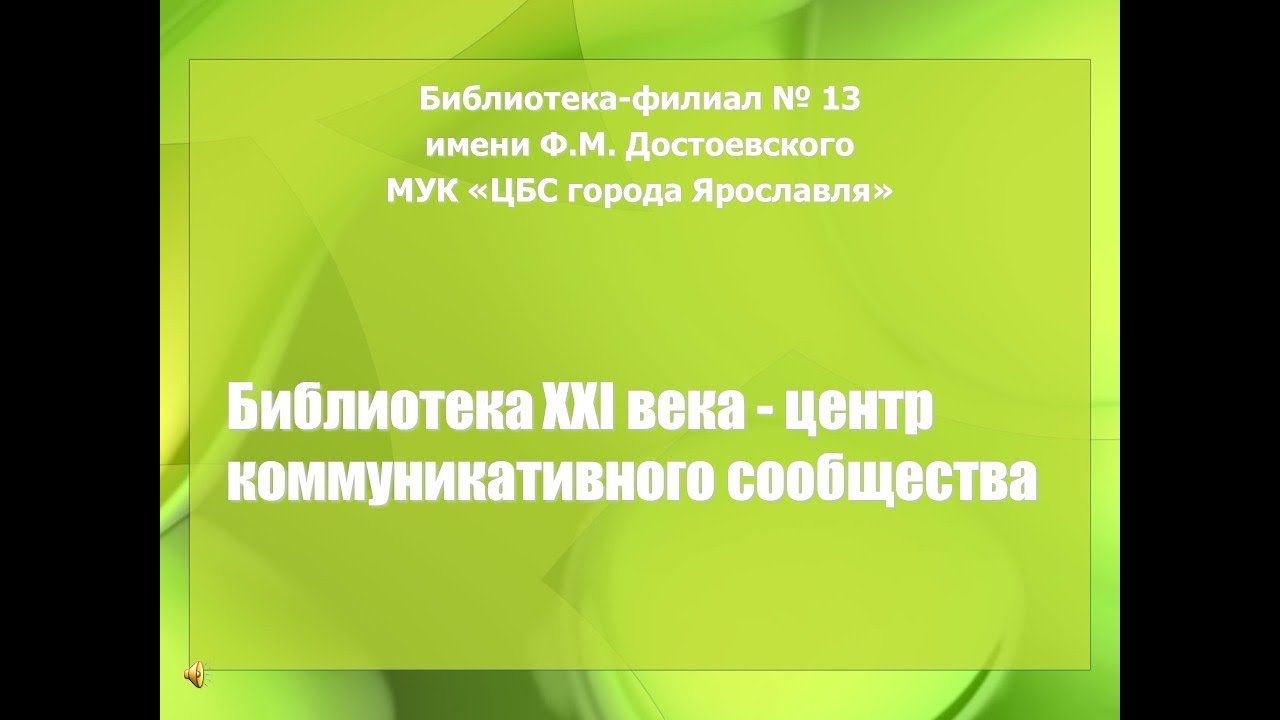 Библиотека-филиал № 13 имени Ф. М. Достоевского представляет из своей коллекции мультимедийную презентацию «Библиотека XXI века – центр коммуникативного сообщества», созданную в год 110-летия библиотеки и библиотечного обслуживания микрорайона Дядьково.