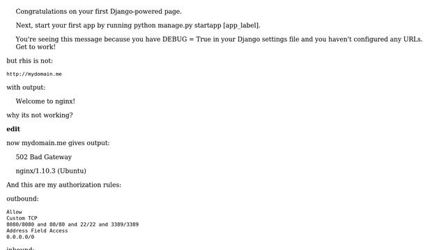 DevOps & SysAdmins: godaddy dns + aliyun host - django app, uwsgi, nginx - shows "502 Bad Gateway" Helpful? Please support me on Patreon: https://www.patreon.com/roelvandepaar With thanks & praise to God, and with thanks to the many people who have made this project possible! | Content (except music & images) licensed under CC BY-SA https://meta.stackexchange.com/help/licensing | Music: https://www.bensound.com/licensing | Images: https://stocksnap.io/license & others | With thanks to user Zenexer (serverfault.com/users/152596), user yourstruly (serverfault.com/users/430775), and the Stack Exchange Network (serverfault.com/questions/868288). Trademarks are property of their respective owners. Disclaimer: All information is provided "AS IS" without warranty of any kind. You are responsible for your own actions. Please contact me if anything is amiss at Roel D.OT VandePaar A.T gmail.com