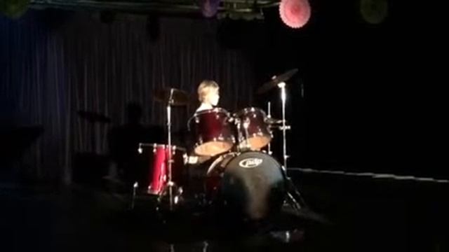 J playing Eye of the Tiger on drums. He's using another boy's drum set, but wanted to bring his own snare and symbol with tambourine attached. This was from his school variety show in May 2015.