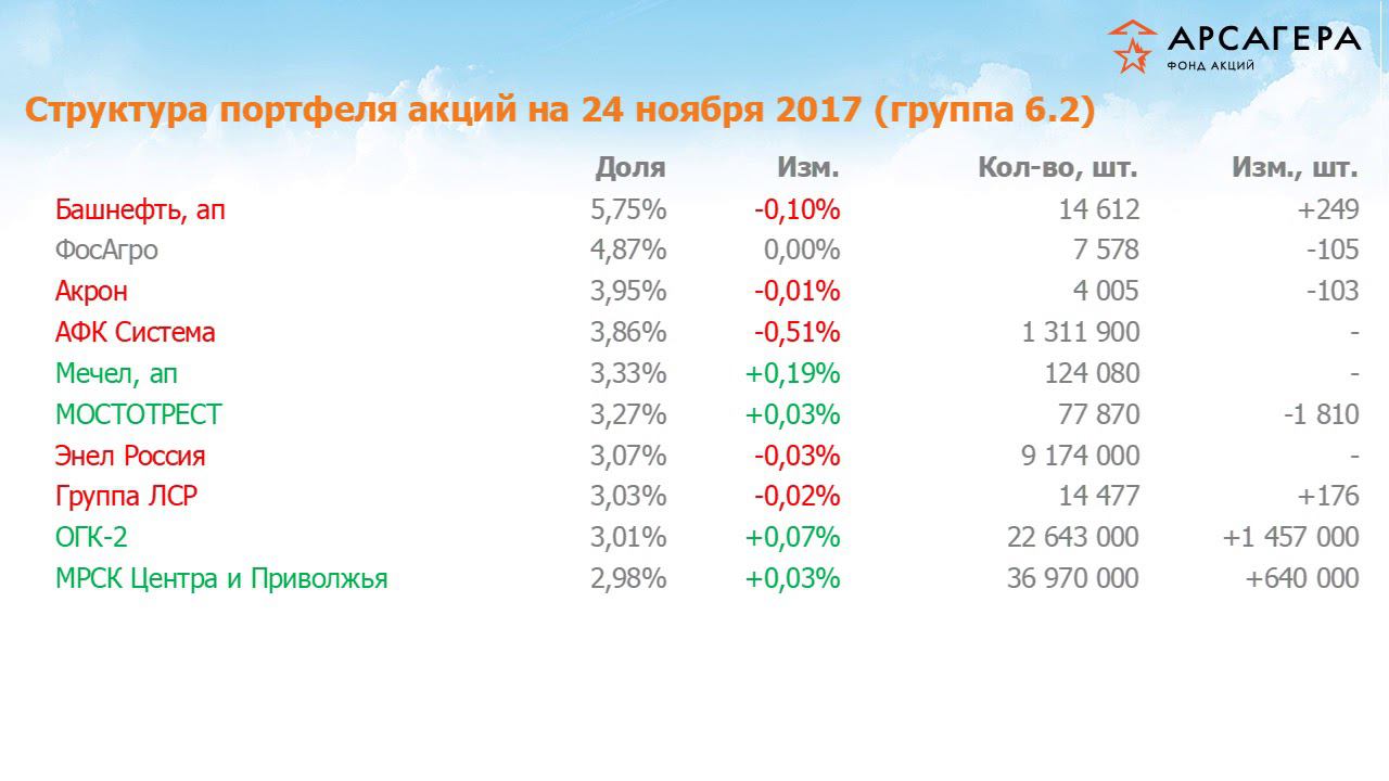Заместитель начальника аналитического управления УК Арсагера Андрей Валухов в программе «Наши фонды» с анализом фонда «Арсагера – фонд акций» за период с 10 ноября по 24 ноября 2017 года. Здравствуйте, уважаемые зрители! С вами Андрей Валухов, я расскажу об операциях с активами «Арсагера - фонд акций» за период с 10 ноября по 24 ноября 2017 года. Стоимость пая фонда «Арсагера – фонд акций», изменение индекса ММВБ за период с 10.11 по 24.11.17 За отчетный период стоимость пая изменились положительно, а индекс ММВб - отрицательно. Переходим к активам фонда. Состав и структура группы 6.1 портфеля фонда «Арсагера – фонд акций» на 24.11.17 В группе 6.1 покупали бумаги всех эмитентов кроме Сбербанка и ФСК ЕЭС. Состав и структура группы 6.2 портфеля фонда «Арсагера – фонд акций» на 24.11.17 В группе 6.2 продавали акции Фосагро, Мостотреста и Акрона. Покупали бумаги Группы ЛСР, ОГК-2, МРСК Центра и Приволжья, префы Башнефти. Состав и структура группы 6.3 портфеля фонда «Арсагера – фонд акций» на 24.11.17 В группе 6.3 покупали акции МРСК Центра, МРСК Волги, Банка Санкт-Петербург, продавали бумаги ПРОТЕКа. В группе 6.4 покупали акции ЧМК. Отраслевая структура портфеля фонда «Арсагера – фонд акций» на 24.11.17 В отраслевой структуре фонда отметим снижение доли эмитентов из отрасли прочие. Протоальфа портфеля фонда «Арсагера – фонд акций» на 24.11.17 На экране представлены агрегированные фундаментальные показатели портфеля фонда и индекса ММВБ. Показатели рассчитываются исходя из текущих цен акций, а также прогнозов по прибыли и балансовой стоимости компаний по итогам 2017 года. Мы стремимся в долгосрочном периоде превосходить результаты индексного фонда. Рейтинги фонда «Арсагера – фонд акций» на 23.11.2017 На ваших экранах информация о местах фонда в рейтингах по доходности и изменении стоимости пая и индекса ММВБ. В заключение наш постулат №5: Применение экономических моделей - залог успешного прогнозирования изменения цен на финансовые активы и недвижимость На этом я прощаюсь. Всего хорошего, до свидания.