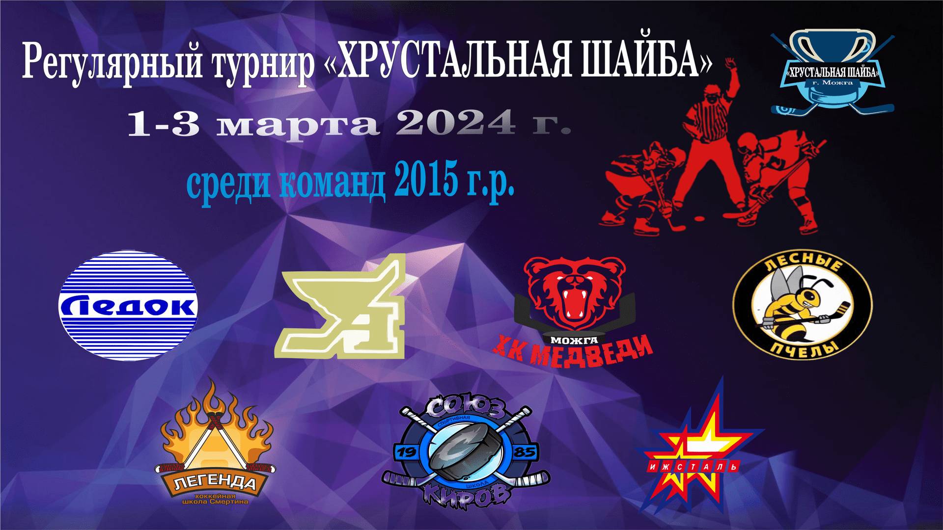 Участники: юноши 2015 г.р., и младше. Даты проведения: 01-03.03.2024 год. Статистика: https://r-hockey.ru/stat/crystalpuck/2024/24214/teams Команды https://r-hockey.ru/stat/crystalpuck/2024/24214/calendar#filter- Календарь https://r-hockey.ru/stat/crystalpuck/2024/24214/table Таблица https://r-hockey.ru/stat/crystalpuck/2024/24214/result Результаты https://r-hockey.ru/stat/crystalpuck/2024/24214/player#filter-type:all Лучшие https://r-hockey.ru/stat/crystalpuck/2024/24214/video Трансляции игр