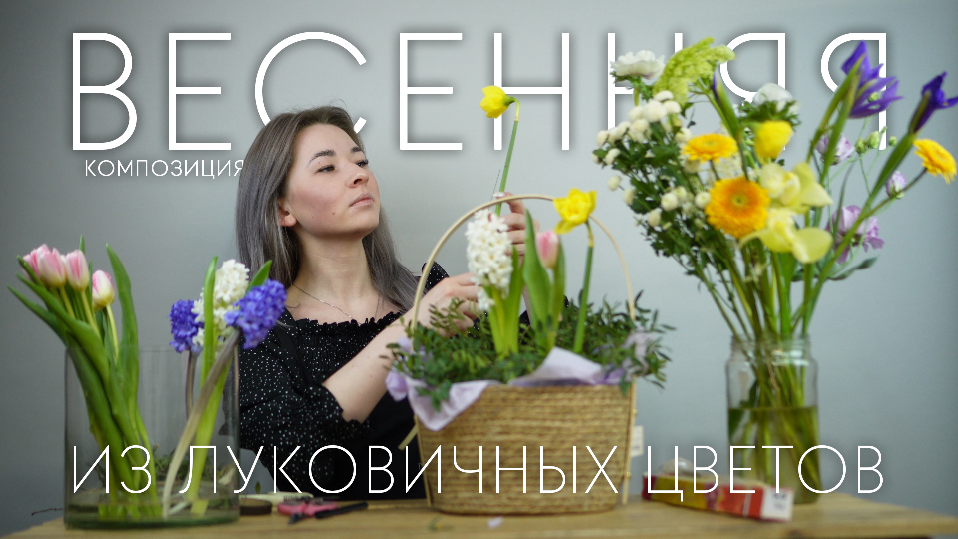 Весенняя композиция из луковичных цветов в корзинке: как крепить цветы с мягким стеблем в оазисе?