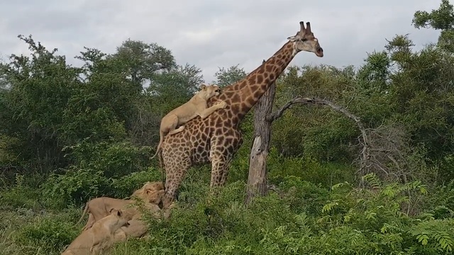 Кадры, снятые на прошлой неделе (18 января) в Национальном парке Крюгера, Южная Африка, показывают обезумевшего жирафа, укушенного снизу многочисленными львами, в то время как более проворная львица кусает за спину жирафа, оседлав его.