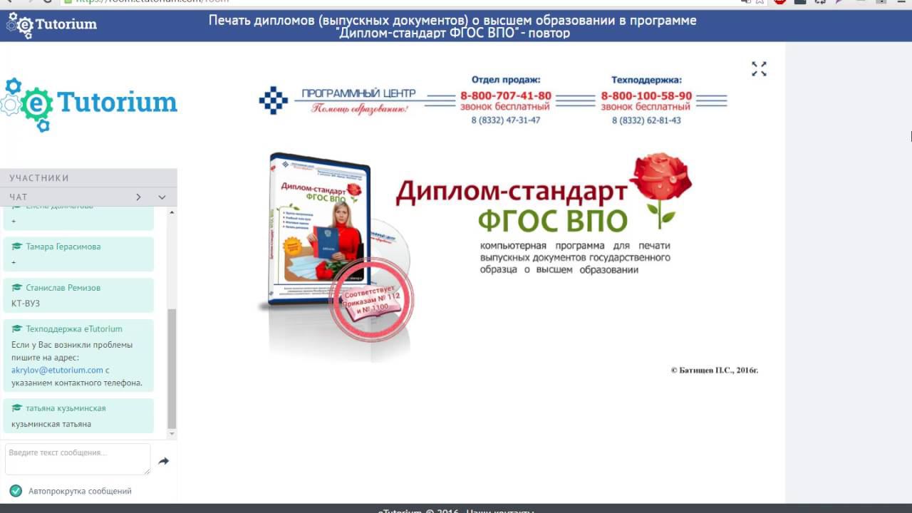 Вебинар для методистов, секретарей, специалистов учебной части образовательных организаций высшего образования от Программного центра "Помощь образованию". Тема: Печать дипломов (выпускных документов) о высшем образовании в программе "Диплом-стандарт ФГОС ВПО" Дата: 16.06.2016