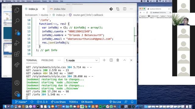 En este video se muestra la taxonomía o estructura de folders y archivos que se generan al crear un proyecto con express-generator. Se donde se crea el web server, donde se configura expressjs y el manejo de las rutos junto a las vistas. Se desarrollo un pequeño formulario para explicar los métodos expuestos en el objeto router de express, el objeto request y response.