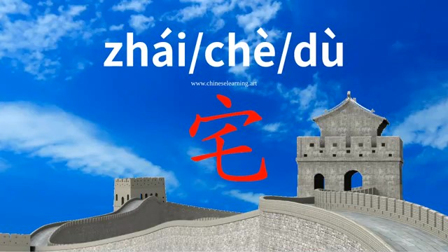宅 (zhái) residence, habitation; to stay at home; hang around at home