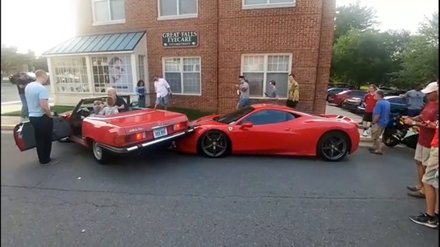 Неприятное происшествие произошло в американском городе Грейт-Фолс (штат Виргиния). Женщина на стареньком Mercedes-Benz 380SL 1980-х годов выпуска припарковалась на капоте суперкара Ferrari 458 Speciale. Сначала женщина не понимает, что совершила наезд на другой автомобиль, пока не появляется владелец Ferrari: «Вы серьёзно? Вы, что, чёрт побери, серьёзно? Это самая тупая вещь, что я когда-либо видел», — удивился мужчина. Стоимость суперкара Ferrari 458 Speciale 2015 года выпуска доходит до 300 тысяч долларов.
