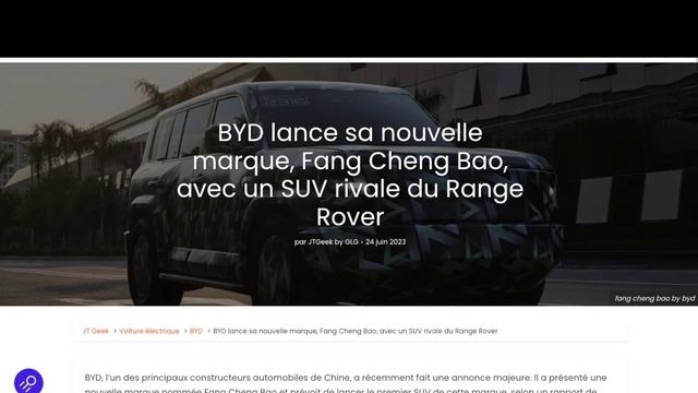 Découvrez dans ce JT du Geek la toute dernière nouveauté de BYD, le constructeur automobile chinois. Avec sa nouvelle marque Fang Cheng Bao, BYD lance un SUV qui pourrait défier le Range Rover. Pour plus d'informations, retrouvez l'article complet sur notre site JTGeek.com. News Jtgeek : https://jtgeek.com/byd-lance-sa-nouvelle-marque-fang-cheng-bao-avec-un-suv-rivale-du-range-rover/ #BYD #FangChengBao #SUV #VoitureElectriqueChinoise Deviens instigateur d'aventure sur : https://fr.tipeee.com/jt-geek-china Toutes mes vidéos sont sur legeek.tv Le Jtgeek c’est 5 Chaines Youtube : -GLG Reviews http://youtube.com/glgreviews -GLG Vidéo http://youtube.com/lesmagouilles -Jtgeek Le blog: https://www.youtube.com/@JtgeekChina -By GLG In English: https://youtube.com/@byglg6945 -WTS by GLG http://youtube.com/wtsbyglg