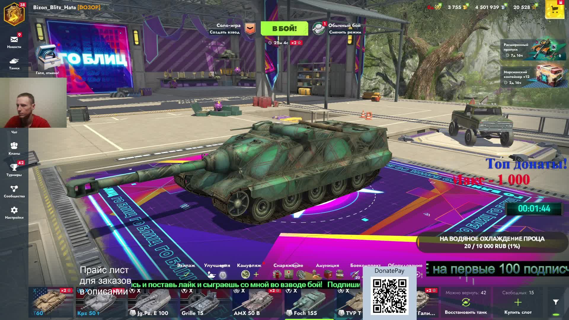 Поддержать меня донатом https://donatepay.ru/don/bizon_blitz_hata https://www.donationalerts.com/r/bizon_blitz_hata (тут же и на водяное охлаждение) Мой YouTube канал --- https://www.youtube.com/@Bizon_Blitz_Hata Подписываемся!) Мой ВКплей --- https://live.vkvideo.ru/blitz_hata Подписываемся!) А так же есть канал и на KICK ---https://kick.com/bizon-blitz-hata Подписываемся!) ПРАЙС ЛИСТ: ДЛЯ TANKS BLITZ и МИР ТАНКОВ Бой во взводе со мной - 55р чем выше сумма тем выше в очереди! НИК свой пишим правильно! Бой на ФУГАСАХ - 275 р ( на каком танке сыграть указываем! Который есть в ангаре у меня ! ) Заказ танка - 55р чем выше сумма тем выше в очереди ! Который есть в ангаре у меня ! Бой на Бабахе она же FV215B 183 - 360р , БОЙ в РБ не РАНДОМ! Чек аккаунта - 560р но я не вижу в этом никакого смысла!)) Посмотреть интересный фильм - 1150р ( название указываем, если он есть на платформе ZONA, тк кроме ютуба и ZONA нет у меня больше каких либо платформ!!! ДЛЯ DOTA 2 В ТУРБО РЕЖИМ!!! Взять героя на ваш выбор если его не забанят - 250р (Кроме INVOKER и MEPPO) Сыграть со мной в пати 1 катку - 250р