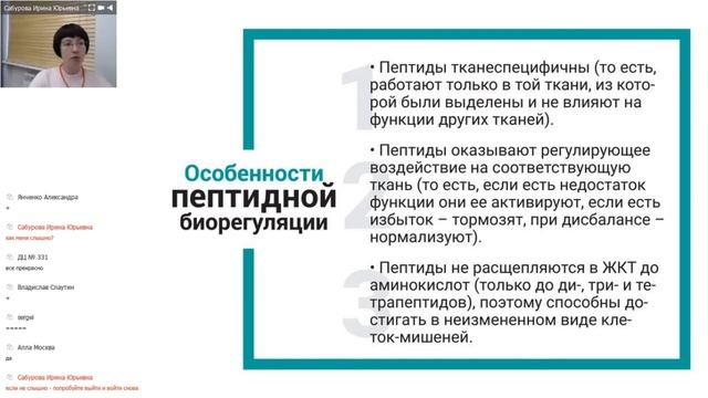 Ирина Юрьевна Сабурова, медицинский консультант НПЦРИЗ, врач-генетик, к. м. н., рассказывает о продукции НПЦРИЗ: Пептидная биорегуляция, эффективность, безопасность, комплексное применение продукции.