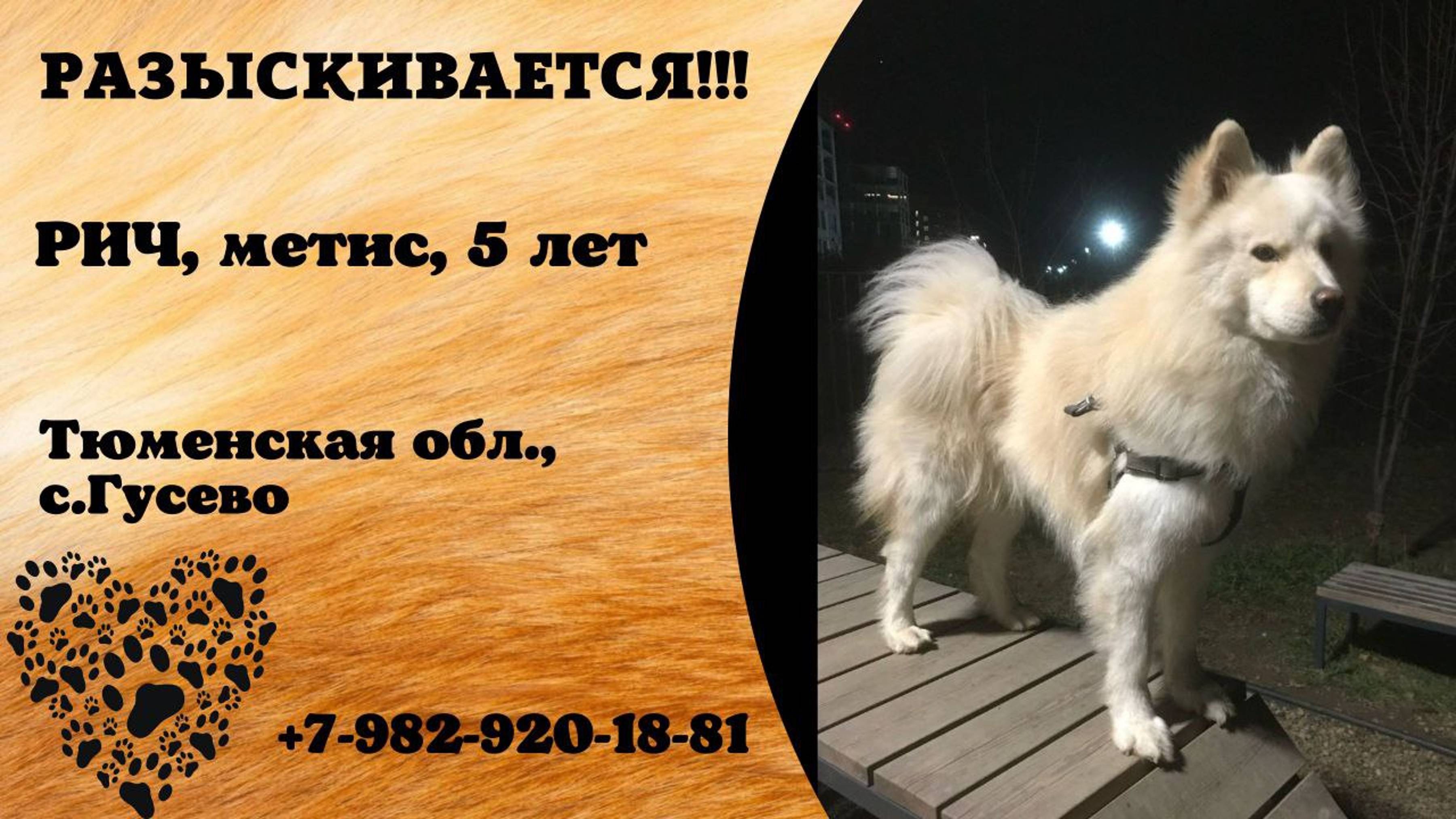 Тюменская Гусево Пропала собака* 12.04 Пропал Пёс, по Кличке РИЧ- 5 лет , порода, Лайка+Самоед, пушистый длинный хвост ,Особые приметы , разноцветный глаз половина голубой половина коричневый. Пропал у дома,был шлейке и поводок 10 метров . Как пропал незнаем . 12.04.25,-15-18 часов в этом районе . Живёт Гусево, ул.Рабочая Кристина Имя хозяина: Кристина Телефон: 79829201881 Адрес: 71Н-1719, Гусево Инфо https://vk.com/wall-198815410_189715 #пропала_собака#тюменская#гусево