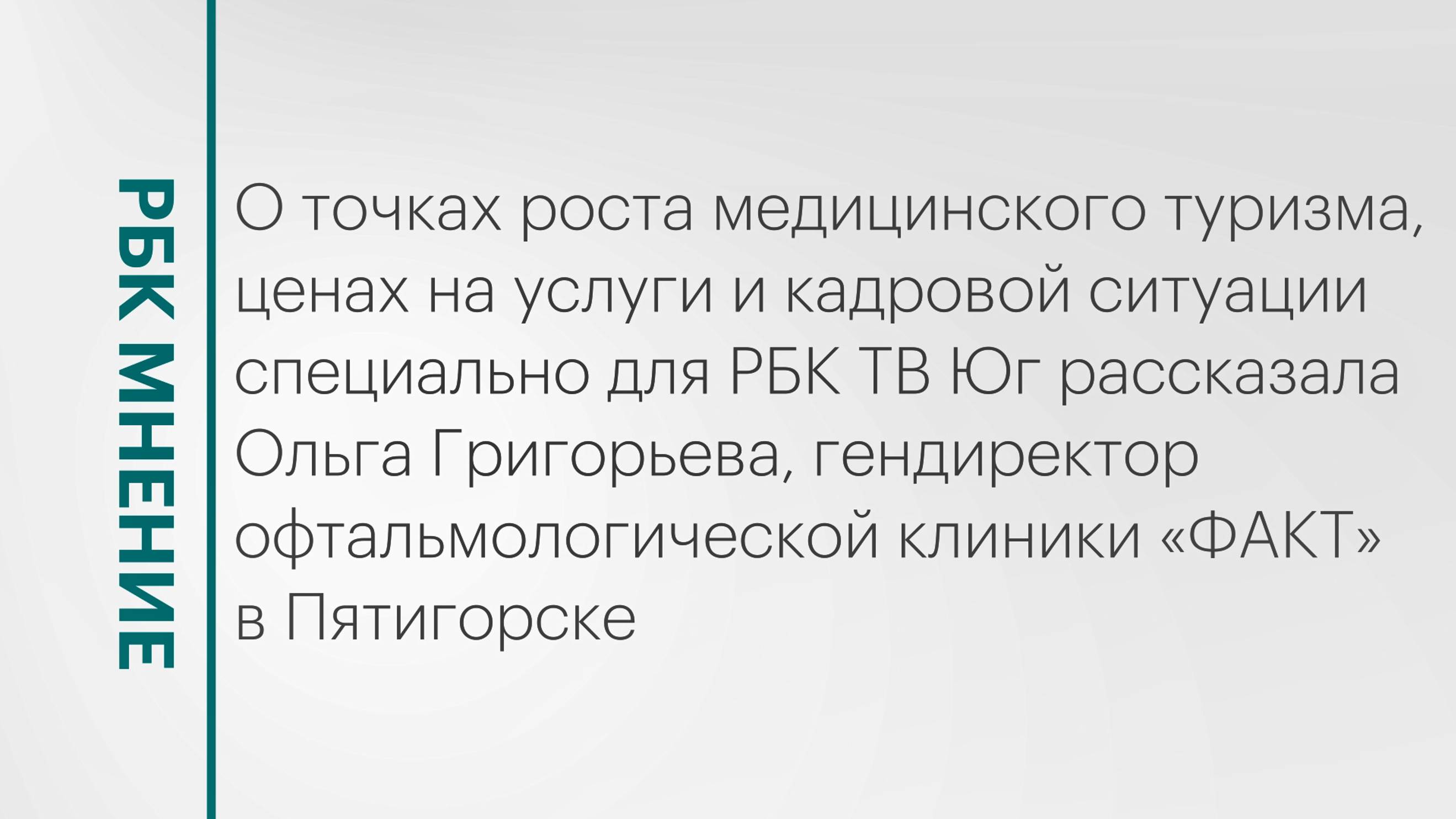 О точках роста медицинского туризма, ценах на услуги и кадровой ситуации специально для РБК ТВ Юг рассказала Ольга Григорьева, гендиректор офтальмологической клиники «ФАКТ» в Пятигорске. Подписывайтесь на нас в социальных сетях: ВКонтакте: https://vk.com/rbcyug Telegram: https://t.me/rbc_krasnodar, https://t.me/rbcrostov, https://t.me/rbc_kavkaz Подпишитесь на канал РБК Юг, чтобы смотреть новые выпуски первыми!