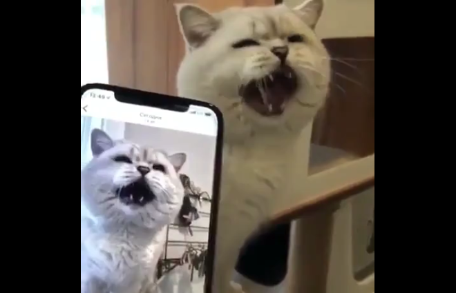 Кот услышал в телефоне свой ор и решил повторить. #кот #прикол #реакция #агрессия