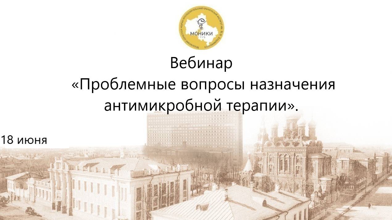 Программа вебинара «Проблемные вопросы назначения антимикробной терапии» Модератор: к.м.н. Ерофеева Светлана Борисовна, врач клинический фармаколог, профессор кафедры фундаментальной и прикладной медицинской деятельности с курсом клинической фармакологии, руководитель отдела экспериментальных и клинических исследований МОНИКИ. В повестке: 16:00│05'ВСТУПИТЕЛЬНОЕ СЛОВО к.м.н. Ерофеева Светлана Борисовна, врач клинический фармаколог, профессор кафедры фундаментальной и прикладной медицинской деятельности с курсом клинической фармакологии, руководитель отдела экспериментальных и клинических исследований МОНИКИ 16:05│25' «СКАТ – практическое применение в стационаре» к.м.н. Смирнова Елена Петровна, заведующая отделением клинической фармакологии ГБУЗ МО МОНИКИ им. М.Ф.Владимирского 16:30│20' «Особенности диагностики бактериальной инфекции. Аутсорсинг микробиологической лаборатории» Павленко Мария Алексеевна, научный сотрудник отделения клинических исследований ГБУЗ МО МОНИКИ им. М.Ф.Владимирского; врач-клинический фармаколог ГБУЗ МО Дзержинская больница 16:50│20' «Инфекции мочевыводящих путей, что важно помнить не только урологам» Шелухин Александр Михайлович, врач клинический фармаколог, заведующий отделением лекарственного обеспечения ГБУЗ МО МОНИКИ им М.Ф.Владимирского 17:10│10 Дискуссия, ответы на вопросы, подведение итогов. Заключительное слово