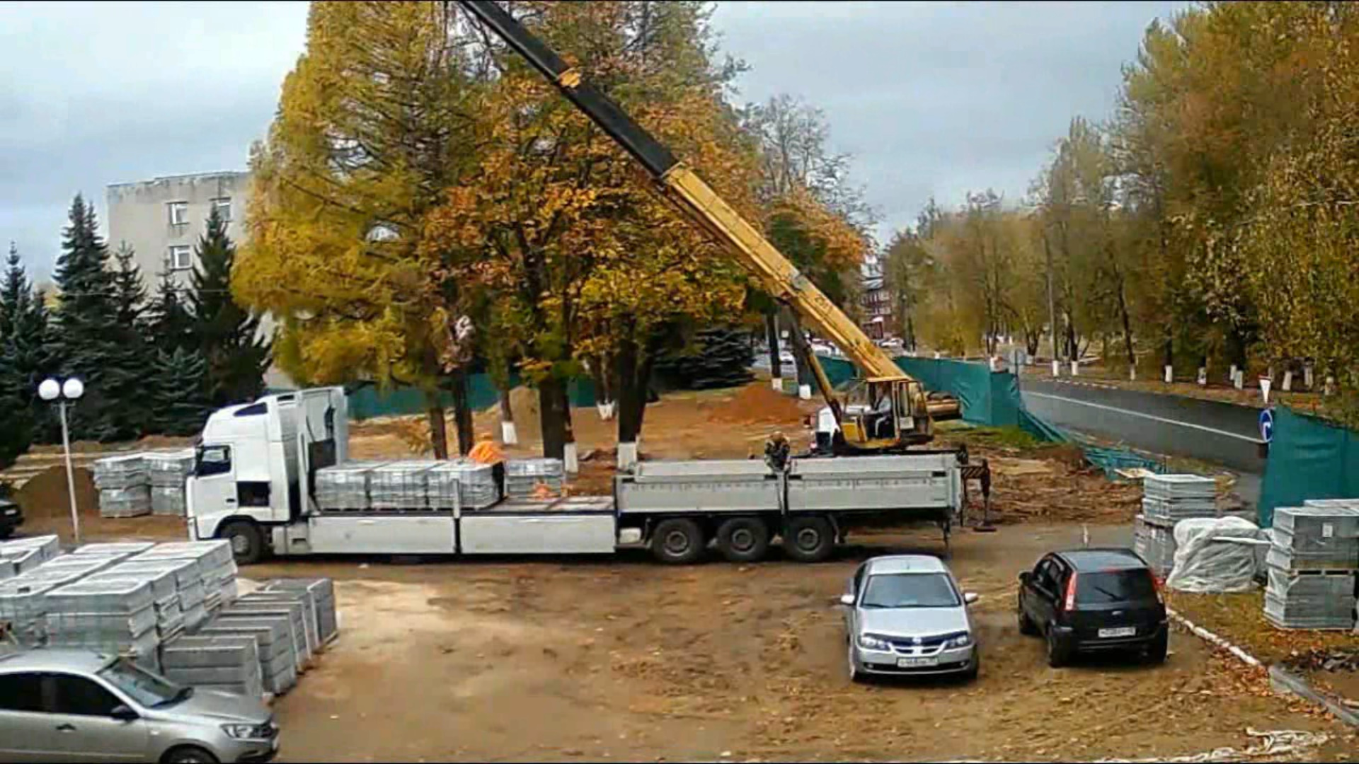 Разгрузка и укладка тротуарной плитки у Аллеи Боевой славы в городе Вязники. Съемка 06-07.10.2023
