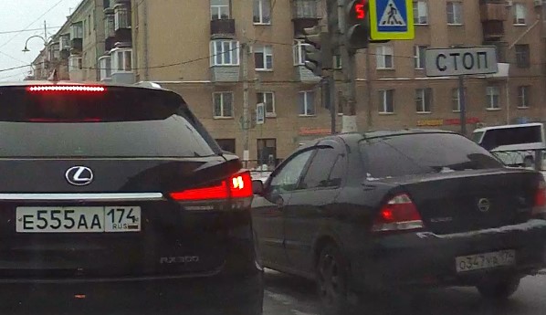 Пересечение стоп-линии и выезд на перекрёсток на запрещающий движение сигнал светофора. Госномера нарушителей: О347УА 174, Nissan Almera Classic 2006 г.в., чёрный и Е555АА 174 Lexus RX 2020 г.в., чёрный. Перекрёсток ул. Ленинградской и ул. Ленина. 07-02-2022 п. 6.16 ПДД Дорожный знак "Стоп-линия". Место остановки транспортных средств при запрещающем сигнале светофора. п. 6.2. ПДД - жёлтый сигнал запрещает движение, красный сигнал запрещает движение, зелёный сигнал разрешает движение. п. 6.13 ПДД - при запрещающем сигнале светофора... водители должны остановиться перед стоп-линией (знаком 6.16).