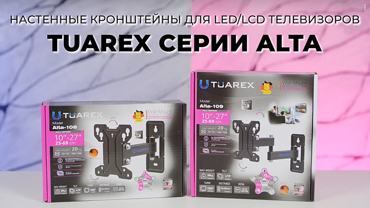 TUAREX ALTA надёжно удержит экран размером 10"-27" дюйма и весом 20 кг. Простая конструкция TUAREX ALTA идеально подойдет для самостоятельного монтажа. Наклонно-поворотная регулировка позволит наклонять вверх и вниз на ±15°, поворачивать влево и вправо на 180°, и выдвигать ТВ от стены. Кронштейны подходят для большинства телевизоров популярных брендов, таких как Samsung, LG, Sony, Panasonic, Sharp, Toshiba, KIVI, Xiaomi Mi, SUPRA, Hyundai, Erisson, Horizont, JVC, Thomson, HAIER, BBK, Витязь, Веко, BQ, OZON, SkyLine, Pioneer, Philips, Rolsen, Harper, Hisense, Hitachi, Polarline, Prestigio и других. Крепёжные отверстия TUAREX ALTA изготовлены по стандарту VESA. В комплектацию TUAREX ALTA входят необходимые для монтажа материалы. Вся продукция обеспечивается гарантийными обязательствами. 25 лет гарантии на все сварные и механические соединения позволит наслаждаться конструкцией долгий срок. Во время эксплуатации TUAREX ALTA демонстрирует поразительную износостойкость и безотказность. TUAREX ALTA-108 https://www.kromax.ru/produce/pan_tilt/8479/ TUAREX ALTA-109 https://www.kromax.ru/produce/pan_tilt/8480/
