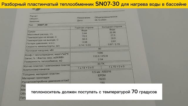 https://www.ozon.ru/product/plastinchatyy-razbornyy-teploobmennik-sn07-30-dlya-nagreva-vody-v-basseyne-80-m3-80-kvt-1342772253/ Пластинчатый теплообменник SN07-30 для нагрева и поддержания температуры воды в бассейне. 1. Мощность - 80 кВт. 2. Температура греющего теплоносителя: Вход:70С, Выход:50С 3. Воду в бассейне теплообменник нагревает до 30С 4. Поверхность теплообмена - 2,04 м2 (30 пластин) 5. Патрубки Ду50 (фланцы) 6. Пластины изготовлены из нержавеющей стали AISI316, толщина 0,5 мм. Данный теплообменный аппарат подходит для открытых бассейнов объемом до 80м3. При эксплуатации в сезоны: весна-лето-осень. ✅ Пластины теплообменника изготовлены из нерж. стали - AISI316 ✅ Высокие рабочие характеристики: макс. рабочее давление - 16 бар., макс. рабочая температура - 150С. ✅ Гарантия 3 Года ✅ Разборная конструкция позволяет легко промывать и обслуживать теплообменник. Мы производим пластинчатые теплообменники с 2009 года, поэтому можем предложить вам лучшие условия: ? - Предложим цену на 30% ниже рынка! ??️ - Изготовим ваш теплообменник за 1 день! ? - Надежно упакуем и доставим оборудование на ваш объект! ?? - Доставим теплообменник в любую точку России! ? - Расчет теплообменников ведется в сертифицированной программе расчета. Подберем на любую мощность и посчитаем за 15 минут! ? - Постоянная сервисная поддержка!.