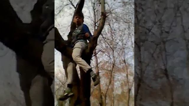 Мальчик залес на дерево,а девочки его достают.