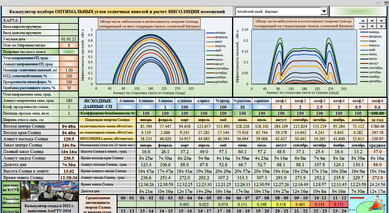 https://www.youtube.com/watch?v=jPLrro8mCn8 Солнечный калькулятор позволяет оперативно и достаточно точно рассчитать оптимальный угол наклона панели солнечной батареи в условиях статистических данных о погоде в данной местности. Вычисления производятся одновременно по более чем 50-ти миллионам параметров. Калькулятор в настоящее время находится в опытном тестировании с наполнением базы данных по реально работающим солнечным электро-станциям. Буду признателен за предоставление сведений о суточной работе действующих солнечных панелей разных производителей.