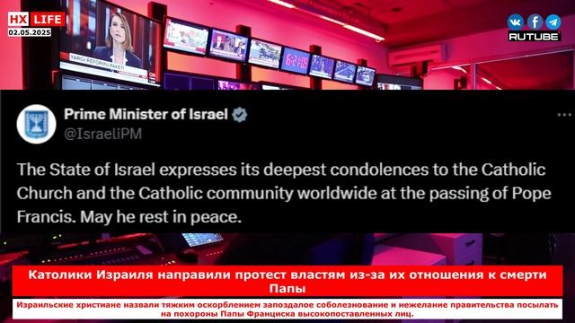Католики Израиля направили протест властям из-за их отношения к смерти Папы Израильские христиане назвали тяжким оскорблением запоздалое соболезнование и нежелание правительства посылать на похороны Папы Франциска высокопоставленных лиц. Христианские общины Израиля направили премьер-министру Нетаньяху письмо протеста против демонстративно оскорбительного отношения правительства к кончине главы РКЦ Папы Римского Франциска, сообщает израильское издание «Кан» 25 апреля 2025 года. «Мы прочли с тревогой и гневом о решении МИД Израиля запретить послам и дипломатическим представительствам выражать скорбь в связи с кончиной Папы Франциска. Это решение, как и отсутствие соболезнований со стороны правительства Израиля, – тяжкое оскорбление не только для христианских граждан Израиля, но и для христиан во всем мире, если не для всего человечества, почитавшего покойного Папу, который был известен как поборник мира, справедливости, человеческого достоинства и межконфессионального диалога», – говорится в обращении. Оскорблены поведением правительства Израиля и в Ватикане: католический дипломат назвал его «постыдным» и сказал, что отношения между Израилем и Ватиканом уже не смогут быть лучше, чем были при Папе Франциске. Правительство Израиля решило не посылать на похороны в субботу никого, сочтя достаточным присутствие посла. В день смерти понтифика МИД Израиля опубликовал на платформе Х некролог с соболезнованиями по случаю кончины Папы Франциска, но через несколько часов удалил его и запретил публиковать соболезнования всем израильским дипломатическим миссиям за границей. Лишь в четверг, с трехдневным опозданием, канцелярия главы правительства Нетаньяху опубликовала краткое изъявление сочувствия. Отмечается, что причиной столь демонстративного неуважения к Ватикану стала «пропалестинская» позиция, занятая Папой Франциском во время войны в Газе. ссылка: https://spzh.eu/ru/news/85993-katoliki-izrailja-napravili-protest-vlastjam-iz-za-ikh-otnoshenija-k-smerti-papy