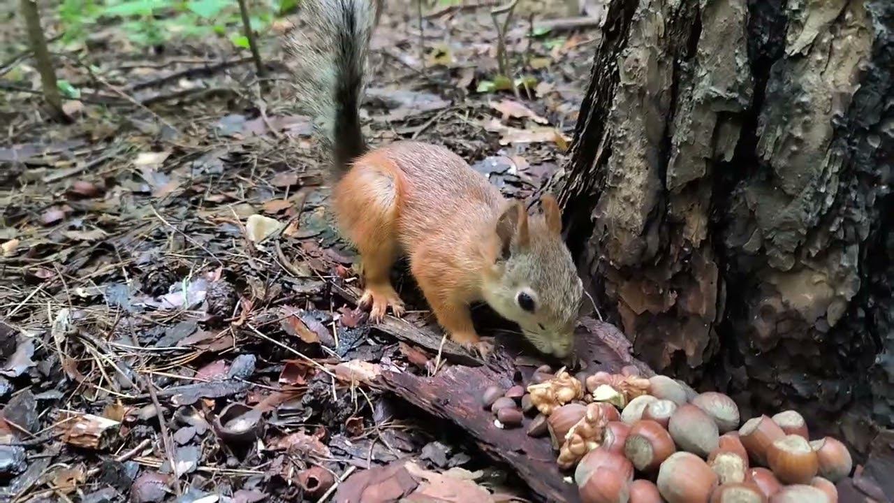 Жёлтенький бельчонок прячет орехи