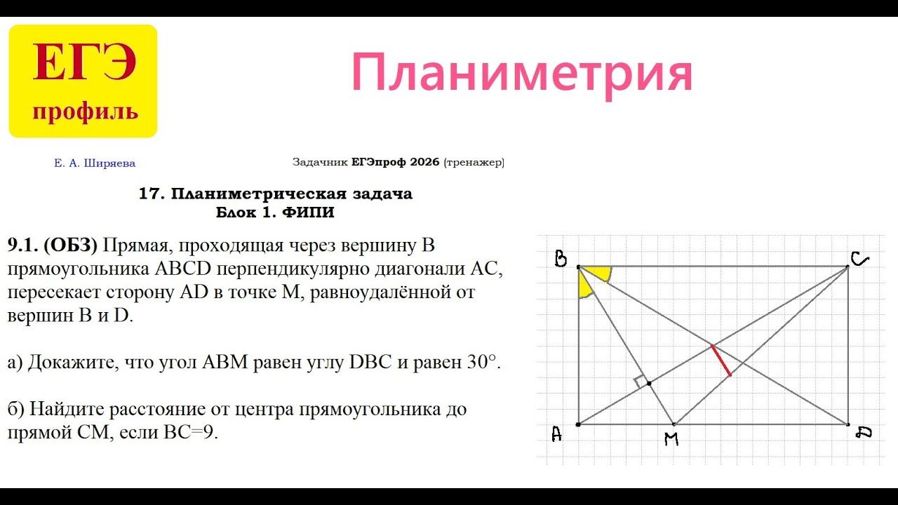 9.1. (ОБЗ) Прямая, проходящая через вершину B прямоугольника ABCD перпендикулярно диагонали AC, пересекает сторону AD в точке M, равноудалённой от вершин B и D. а) Докажите, что ABM=DBС=30°. б) Найдите расстояние от центра прямоугольника до прямой CM, если BC=9.