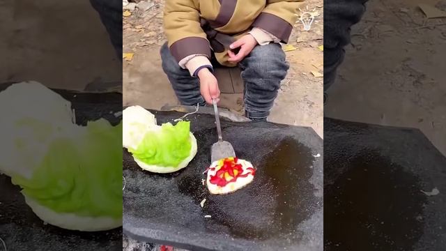 малыш готовит еду на горячем камне