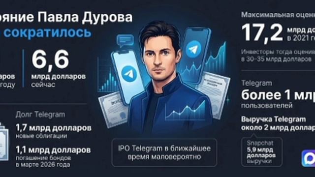 Состояние основателя Telegram Павла Дурова, по оценке Forbes, сократилось с 17,1 млрд долларов в прошлом году до 6,6 млрд долларов. Как отмечается, участники рынка в целом согласны с такой переоценкой и связывают её прежде всего с резким ухудшением рыночной конъюнктуры. Впервые Дуров вошёл в рейтинг Forbes в 2016 году, когда его состояние в списке 200 богатейших бизнесменов России оценивалось в 600 млн долларов. Уже в 2018-м он стал миллиардером и с тех пор регулярно присутствует в глобальном списке издания. Максимальную оценку — 17,2 млрд долларов — Forbes давал Дурову в 2021 году. Тогда Telegram разместил первые облигации с возможностью конвертации в акции с дисконтом к цене будущего IPO, а инвесторы оценивали компанию в 30–35 млрд долларов. Сам Дуров в 2024 году в интервью Financial Times также ссылался на оценку в 30 млрд долларов, которую, по его словам, банкиры проводили в преддверии потенциального размещения. Однако, как подчёркивается, pre-IPO оценки нередко оказываются чрезмерно оптимистичными. За последний год, по словам нескольких инвестбанкиров, новых презентаций Telegram для инвесторов в более или менее открытом доступе не появлялось. Для более сдержанной оценки рынка эксперты предлагают сравнивать Telegram с ближайшим аналогом — американским Snapchat. По числу ежемесячных пользователей платформы действительно сопоставимы: у Snapchat на конец 2025 года было 946 млн пользователей, у Telegram, по словам Дурова, — более 1 млрд. Но по финансовым показателям разница заметнее. Выручка Snapchat по итогам 2025 года выросла до 5,9 млрд долларов, что почти втрое выше прогнозируемой Дуровым выручки Telegram на уровне 2 млрд долларов. При этом Snapchat завершил год с убытком в 460 млн долларов, тогда как Telegram показал убыток в 222 млн долларов только за первое полугодие. Капитализация Snapchat за год почти удвоила падение и снизилась до 8,7 млрд долларов. Именно это, по мнению собеседников Forbes, и стало одним из главных факторов пересмотра оценки Telegram, а вместе с ней — и состояния самого Дурова. Дополнительное давление на оценку, вероятно, оказывает и долговая нагрузка компании. Уже в марте Telegram предстоит рассчитаться с держателями первых облигаций, выпущенных на пять лет под 7% годовых. Их погашение намечено на 22 марта 2026 года. Часть этих обязательств Дуров заранее рефинансировал, разместив в июне новый выпуск облигаций на 1,7 млрд долларов, но уже с более высокой доходностью — 9%. Сам по себе рост купона рынок обычно воспринимает как сигнал более высокого риска. При этом в марте компании всё равно предстоит погасить оставшиеся старые бонды примерно на 1,1 млрд долларов. Откуда будут взяты эти средства, публично не уточняется. Один из аналитиков долгового рынка допустил, что расчёт с держателями облигаций может пройти не через IPO, а за счёт прямой передачи акций Telegram. По его версии, на это косвенно указывает и состав инвесторов, участвовавших во втором размещении, среди которых назывались BlackRock, структуры из Абу-Даби, Mubadala и другие крупные фонды. Что касается перспектив IPO Telegram, то здесь оценки участников рынка довольно сдержанные. По словам собеседников Forbes, в ближайшее время размещения ждать не стоит. Среди причин называют блокировки Telegram на ключевых рынках, включая Россию и Иран, а также общее ухудшение рыночной ситуации. При этом, как считают участники рынка, размещаться по оценке существенно ниже той, которую сам Дуров на
