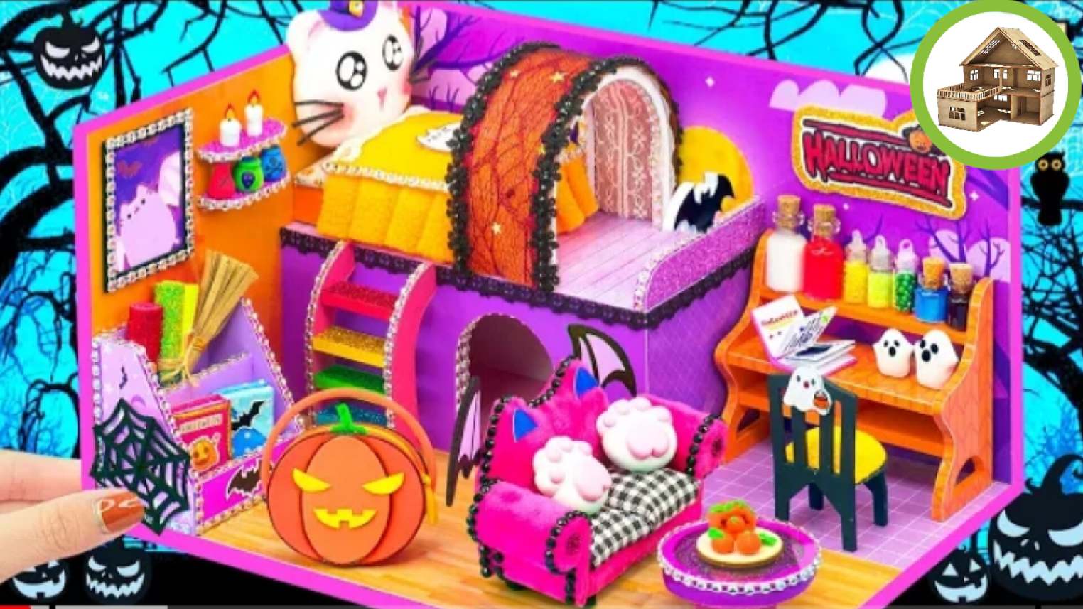 Миниатюрный домик на Хэллоуин с миломи комнатами для семьи и для котенка из картона /180