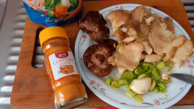 Быстрый диетический Суп с грибами. Сварить овощной бульон 5-10 минут, с морковкой, лук, сельдерей, лук порей белая часть, пряности пастернак и фенхель. Ненужные овощи вынуть. В бульон кладём макароны, горошек, специи, вегета, кукурма. Варим 5-10 минут. Добавить грибы, томаты черри, болгарский перец, лук порей, чеснок, зелень.