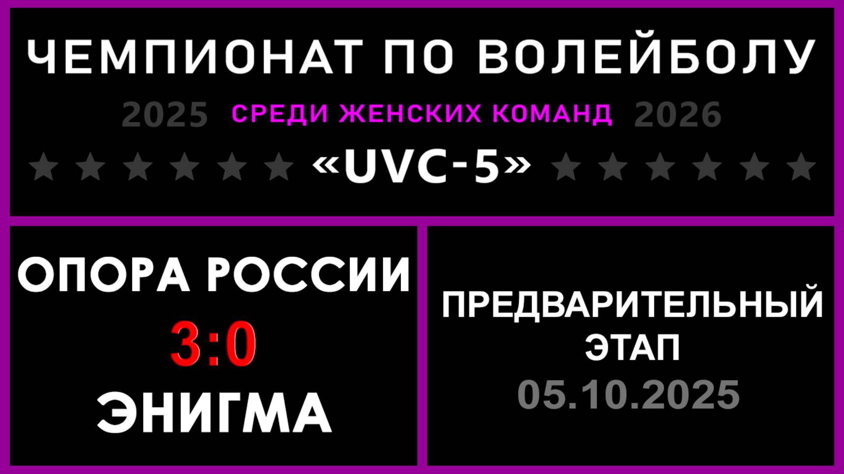 UVC-5 (Девушки): Чемпионат UVC Лиги по волейболу среди женских команд 2025-2026 гг. Результаты игры: Предварительный этап 05.10.2025 Опора России - Энигма 3:0 (25:8, 25:14, 25:16) Вторая уверенная победа Опоры России за два дня! Энигма пока в поисках оптимального состава и нужной расстановки, но уже есть хорошая подача и защита! ✅Обе команды прошли в следующий этап конкурса «РЕШАЛЫ»! ✅ Точный исход матча угадали 49 участников «Nostradamus trophy»! #UVC_ЛИГА_ЧЕМПИОНАТ_UVC_5_Девушки