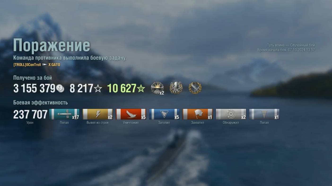 Подводная лодка: X Gato Игрок: 0ConTroll (EU) Карта: Путь воина - Случайный бой Урон: 237к Gato - Подводная лодка США 10 уровня