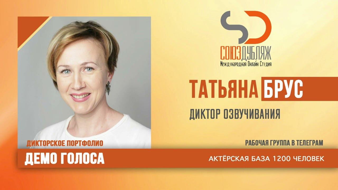#СоюзДубляж #БазаДикторов #Озвучка ✔️Татьяна Брус, диктор озвучивания. Международная Онлайн-Студия "СОЮЗДУБЛЯЖ" - профессиональная озвучка и дубляж. ▪️Рабочая группа в Телеграм: https://t.me/soyuzdubliazh ▪️Контакт для связи: https://t.me/SoyuzAdmin ▪️Подпишись:https://www.youtube.com/c/SOYUZDUBLIAZH ▪️Сайт: https://www.soyuzdubliazh.com/ Лучшие голоса для вашей аудиорекламы и видеороликов. База дикторов - 5 000 человек, профессионального уровня на ENG| FR| TR| RU| ISR| AZ| UA| KZ| UZ| языках. Мужские и Женские топовые голоса для озвучки любых проектов, таких как: Рекламы, Презентации, Фильмы, Сериалы, Игры, Мультфильмы, ТВ Шоу, Аудио-видео визитки. ✔️Сотрудничая с нами вы получаете свой проект под ключ, не выходя из дома или офиса. Наша слаженная команда из лучших дикторов, актёров озвучивания, режиссёров и звукорежиссёров в кратчайшие сроки озвучат или отдублируют ваш заказ на профессиональном уровне. Образцы работ нашего портфолио вы сможете посмотреть на канале СОЮЗДУБЛЯЖ. ВНИМАНИЕ: ✔️Мы приглашаем специалистов озвучки к сотрудничеству в нашей команде. Вы можете пройти по ссылке в наш телеграм канал и связаться с Админом для обсуждения. ✔️Всем заказчикам подобных медиа проектов по озвучки и дубляжу фильмов, сериалов, документалок обращаться непосредственно к Админу Телеграм группы СОЮЗДУБЛЯЖ, пройдя по ссылке: Проходи по ссылке: https://t.me/soyuzdubliazh International Online-Studio SOYUZDUDLIAZH presents a highly professional approach in voice-over and dubbing. ▪️Our working group https://t.me/soyuzdubliazh ▪️Chief manager https://t.me/SoyuzAdmin ▪️Follow https://www.youtube.com/c/SOYUZDUDLIAZH ▪️Web: https://www.soyuzdubliazh.com/ We offer You the best Voices for your Audio commercials and Video`s. Our Database contains over 5 000 voices of native speakers and high-class foreign language specialists in ENG| FR| TR| RU| ISR| AZ| UA| KZ| UZ|. Male & Female top level voices for all the variety of dubbing projects such as commercials, presentations, movies, TV-series, video and computer games, cartoons, TV-shows, audio & video portfolio’s – all in one place. As your business partner we guarantee a turn-key project without you leaving your house or office. Our target is to make sure that the dubbing of your project is made as quick as possible by a well-coordinated and professional team of the best speakers, film and sound directors. To whom it may concern! We invite dubbing specialists to join our team. Please contact our manager on Telegram https://t.me/soyuzdubliazh
